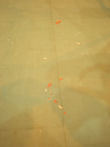 昨日の揺れで天井からペンキが剥がれて破片が床に飛び散っている。