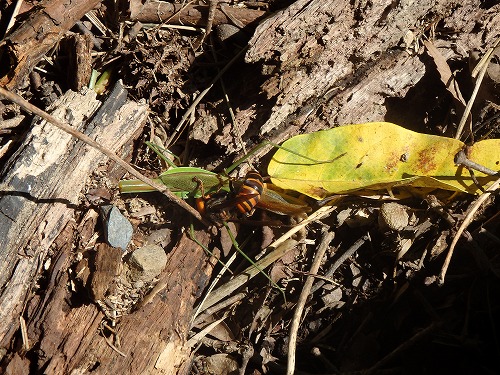 カリバチ(2025年8月4日) 狩った芋虫を運ぶ(2025年8月4日)