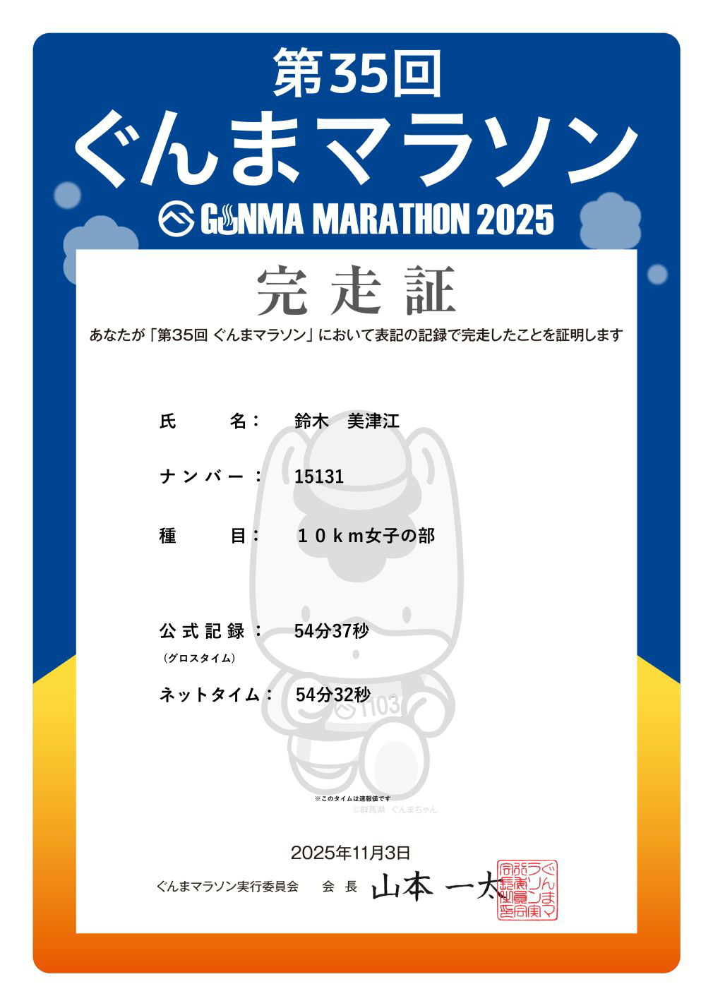 鈴木会員 2025-11-03 第35回 ぐんまマラソン 参加種目:10km