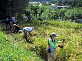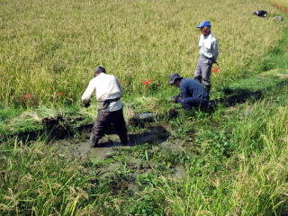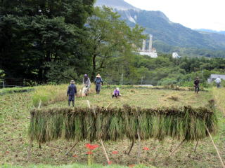 倒伏した6番田 ぬかるみの多かった3番田 3番田のはぜ掛けと機械 刈りの5番田 手刈り風景