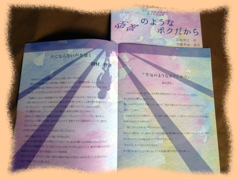 先月、パルテノン多摩で行われたNHK東京児童劇団の公演も、盛況のうちに終了しました。いらしてくださった皆様、ありがとうございました。 私も、当日のゲネプロ、その後の昼・夜の公演、翌日の公演と、全部で5回、続けて観ました。ダブル・キャストになっていて、A組・B組、どちらの公演も、それぞれのカラーがはっきり出ていて、同じ台詞なのに違う雰囲気。どちらも力演でした。回を重ねるごとに、子どもたちが演技の細かい工夫を取り入れ、最後の最後まで全力投球だったのが感動的でした。演出の素晴らしさ、音楽の匠さ、照明の美しさ、振付の軽妙さ、舞台装置の存在感・・・子どもたちの演技力を存分に引き出す、スタッフの技量にも感服します。脚本という形で、この公演に参加することが出来て、とても幸せな夏でした。