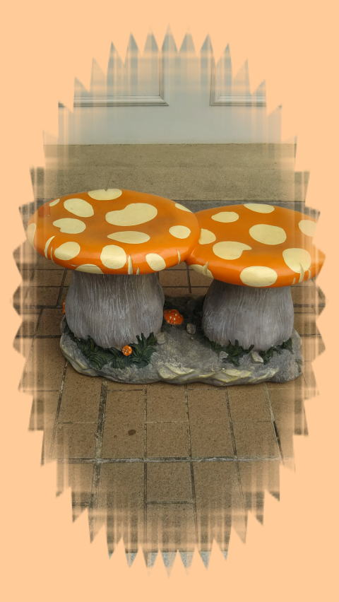 商店街の小径に、季節にぴったりなキノコの椅子が置いてありました。仲良しと二人、並んで座るのにいいですね。結構、すわり心地が良さそう。