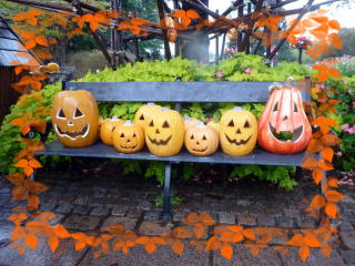 ベンチに並んだ、カボチャたち。目は三角、口には小さなキバがあるのが、基本のスタイルかな? うちでもカボチャをくり抜いて作ってみたい、と思いつつ、まだ一度もトライしたことはありません。いつか作って、ベランダに飾ってみたいな。