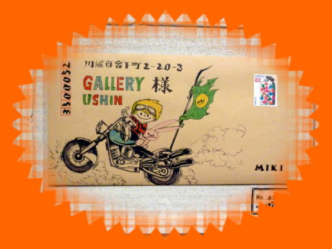 こちらは、『つぎのページ』という本で、表紙画や挿絵を書いてくれた、小野寺美樹さんの絵封筒。やんちゃな男の子が、相棒のうさぎを引き連れて、バイクに乗って、勝利の笑顔。 勝ち取ったものは、切手の絵柄『大きなキャンディーの瓶』だったのですから、なんとも可愛い戦いです。