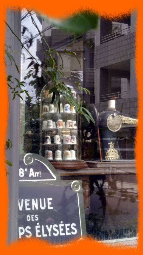 閑静な住宅街に佇む、ヨーロッパ風なお店。ウィンドウ越しにも、アンティークな雰囲気が漂っています。古いミシンの横にあるのは、陶器の指貫ですよね。お裁縫で使う指貫は、日本ではリング型が主流ですが、外国では綺麗な絵のついた、こんな指貫がたくさん使われていたようで、集めて飾っておきたくなります。小さなベルみたい。