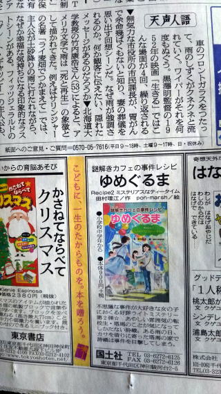 先月、発売された『ゆめぐるま』の2巻目、「ミステリアスなティータイム」の案内が、朝日新聞の天声人語の真下に載っていました。日曜日の朝刊だったこともあり、気づいてくださり、連絡をくださった方々も。ありがとうございます。