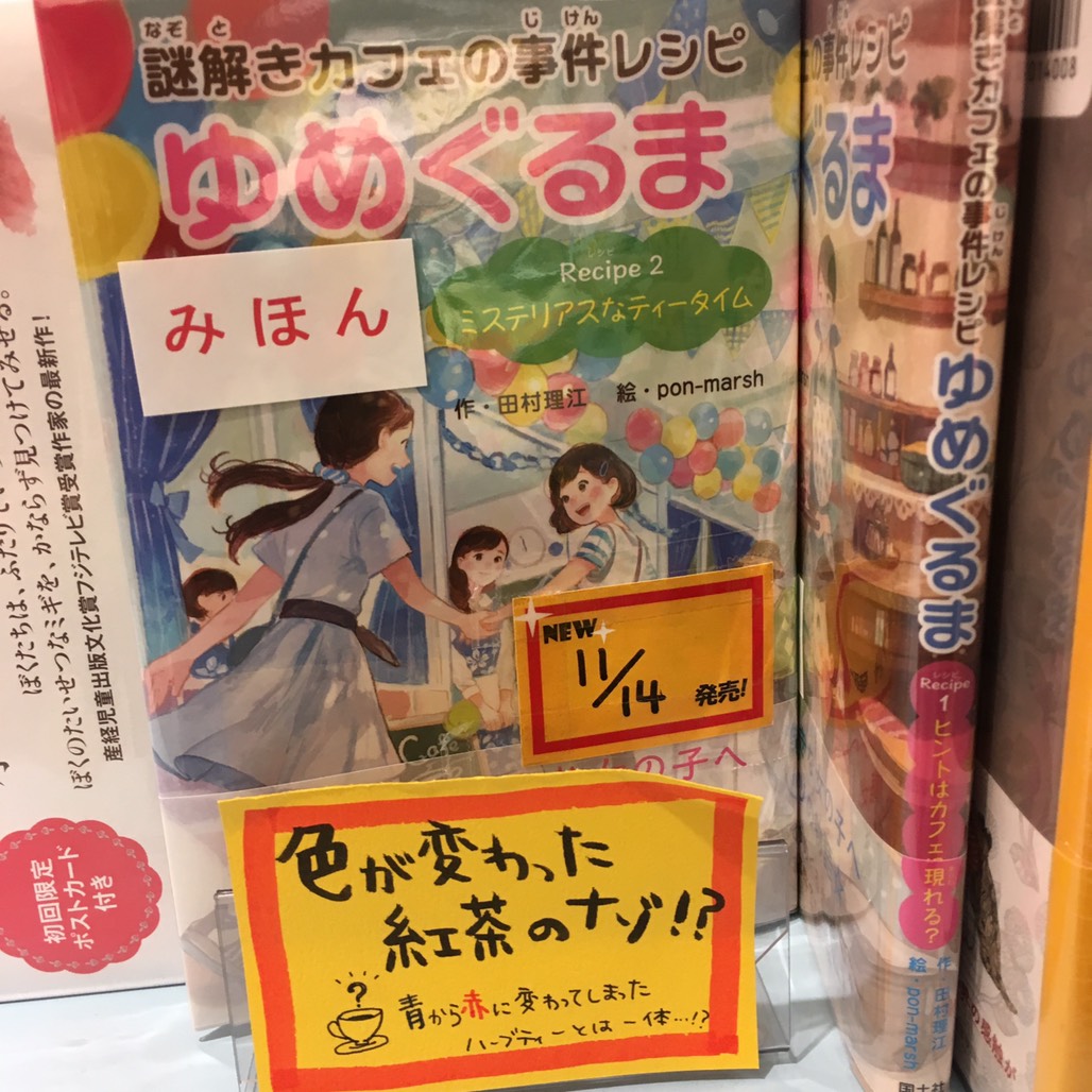 謎解きカフェの事件レシピ『ゆめぐるま』(国土社)は、おかげ様で本屋さんや図書館に並んで、読んで下さった方もいらっしゃるのでは、と思います。上の写真は、流山の本屋さんでの一枚。手書きPOPを付けて頂き、とても嬉しいです。この2巻目は、まさに「色が変わった紅茶のナゾ」を追求しています。手書きのティーカップの絵も可愛い。