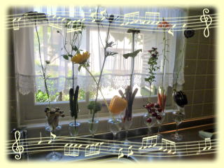 春のキッチンの窓辺が、こんなふうにカラーピーマンやミニキャロットで飾られているのを見ました。見ても楽しいし、その後はお料理に使えるし、実用的なアレンジメントですね。