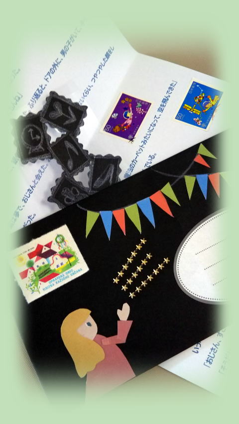 今年も、ギャラリーウシンでやっている絵封筒展に参加しています。今年は色画用紙を切り貼りして、古い絵本風な趣の絵封筒を作ってみました。封筒の中には、切手にまつわる、ささやかな物語が入っています。その物語の挿絵代わりに貼ってある切手は、1979年に発行された、国際児童年記念切手。宇宙遊泳する男の子と女の子の絵柄があり、どちらも50円切手です。絵を描かれたのは、SFファンなら「見たことのあるタッチだ」と思われるでしょう。未来画で活躍された真鍋博さん。真鍋さんと言えば、子どもの頃、よく読んだ星新一さんの本の表紙もたくさん描かれていたなぁ、なんて思い出します。この切手は、郵政博物館がまだ「ていぱーく」と呼ばれていた頃、そこで買ったもの。しまいこんでいましたが、こういう形で使うことが出来て、私も嬉しいです。
