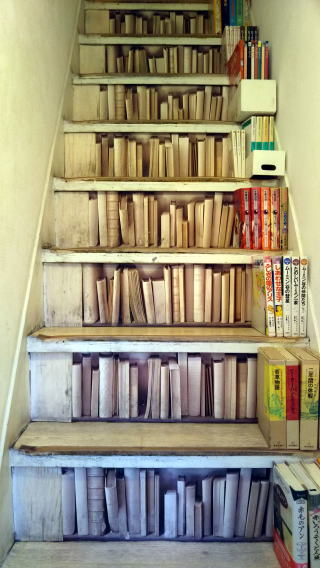 読書の秋の到来、三鷹の街を歩いていたら、本がいっぱいの階段を見つけました。近づいてよく見ると、本は右端の数冊だけが本物で、あとは階段に貼った壁紙なのです。でも、ぎっしり詰まった本好きの本棚みたいに見えるでしょう?