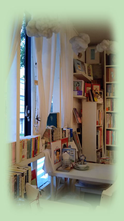 その階段に誘われ、二階へあがると、そこはカフェもやっている古本屋さん。乙女チックな本を集めた、レトロで可愛いお店でした。壁ぎわの本棚の一番上には、『赤い鳥』が並んでいて、ふんわり優しい雲まで、プカプカ浮いています。