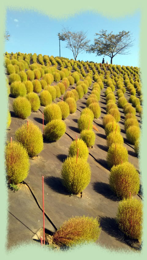 赤く染まったコキアを見ようとコキア畑へ出掛けたら、まだ紅葉には早かったみたいです。でも、黄金色のコキアというのも、きれいでした。近所にもコキアを植えているお家をよく見掛けるようになったので、色づく様子を見守りながら、秋の深まりを感じたいです。