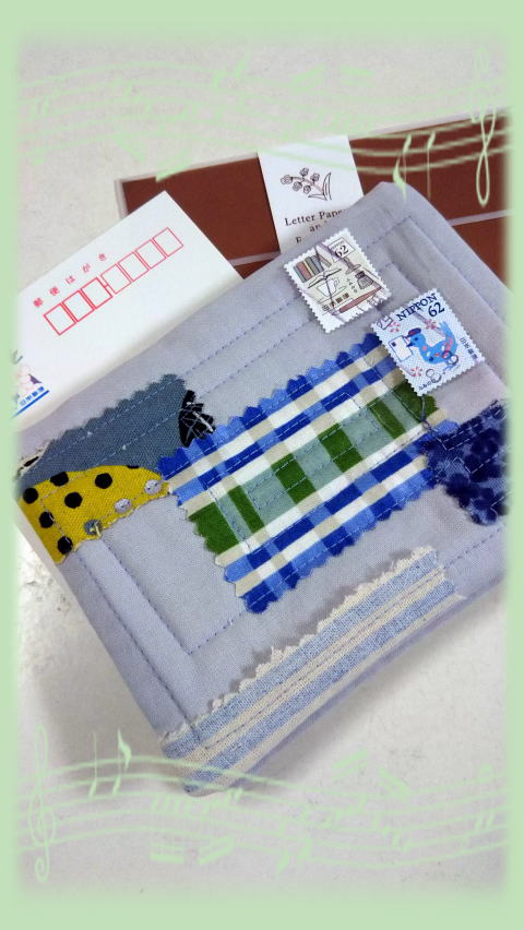 こちらは、ギャラリーウシンさんから届いた、絵封筒です。布の封筒で、開くと二倍の大きさになり、鍋つかみになったり、小物入れになったり、といろいろ活用出来る「万能封筒」なのです。我が家に届いた時は、布封筒の上に、アドレスシールを貼った透明セロファンが重ねられていて、ポストをのぞいた瞬間からインパクト大でした。いつものお手紙とは違うタイプの封筒が届くって、新鮮な驚きです。