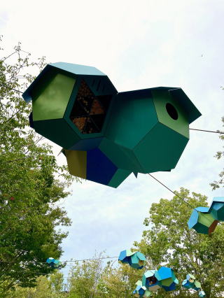 会場の中央には、”静けさの森”という緑の多い場所があり、ここはわりと人が少なく、ちょっと安らぎました。頭上に掲げられた巣箱の中には、鳥ではなく、木片がたくさん詰まっていました。