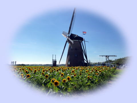 佐倉市(千葉県)のふるさと広場に、満開のヒマワリ。 風車がまわり、跳ね橋が掛かり、