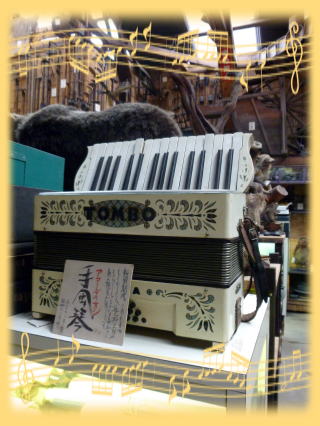 年代物のようなアコーディオン。 日本名で“手風琴”と表示してあるのが、