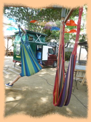 広場には、エスニックな色調のハンモックが揺れていました。子どもたちが、ちゃんと順番を待って、次々に乗っていました。気持ち良さそう。