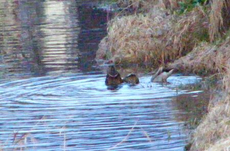 ○ 大川の岸辺をゆく鴨・ マガモの親子