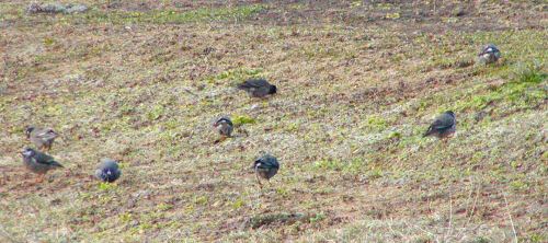 ・ あぜ道で餌をついばむムクドリ