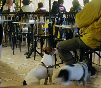 この犬たちは2匹とも、飼い主の足下で行儀よくしていました。