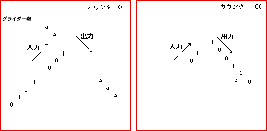 そして、180世代後のカウンタ180の右の図形では、前から6ビットまでのNOTゲート出力01101が得られていることが確認できます。