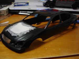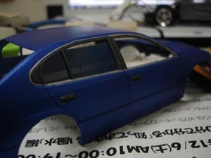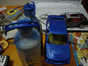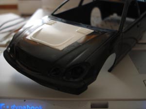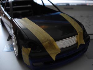 ボンネットいじります。 とりあえずヴェイルサイドのボンネットみたくライト間からのライン入れるのでガイド代わりにマスキングテープ。 |
