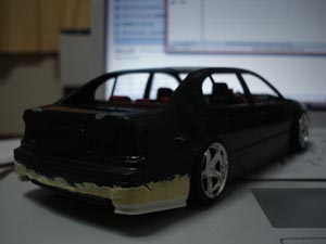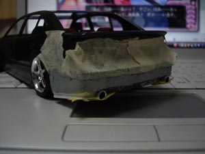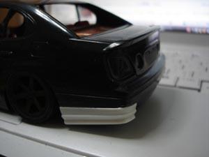 リアも作ります。 純正バンパーに湾岸シリーズの10レクサスRアンダーをサイズ合わせして貼っつけます。 |