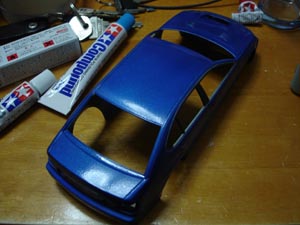 乾燥したら同じくフィニッシャーズのシーサイドブルーにゴールドパールをほぼ同等比で配合。 ベースのブルーはR34のベイサイドブルーやFDのイノセントブルーマイカに似た色です。 |