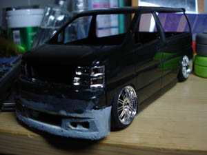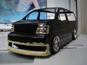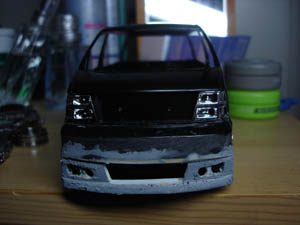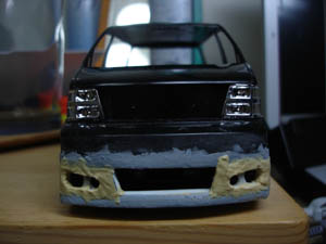 前後バンパーに内巻き気味にパテ盛りました。 まあ最初だからテキトーに。 |