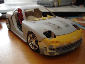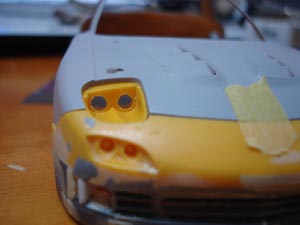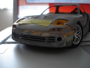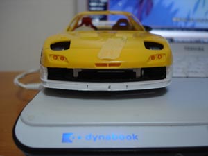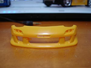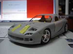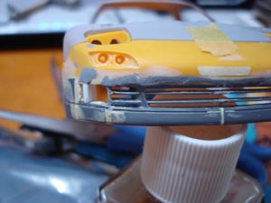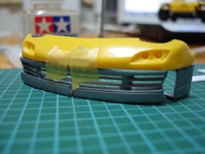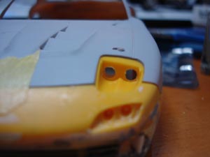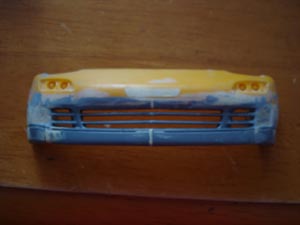バンパー接合部などをパテ埋め。 フォグんとこはまだ適当にだけど形づけ。 |