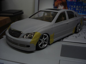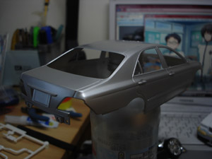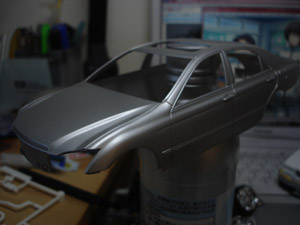 ボディはこのままでいくので早速サフ塗り。 ちなみにわかりにくいですがグリルは後期純正改(メッキ仕様) |