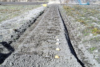 手前の二つ穴に10mほど追加植え付けです。出来れば給食用に!