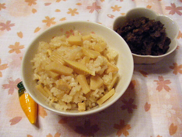 | ♪竹の子ご飯♪ ☆材料(3合) 白米 3カップ 茹で竹の子 120g 油揚げ 1枚(80g位) 合わせ調味料A・・・水カップ2、だし5g、醤油大さじ1、 みりん大さじ3 ☆作り方 @お米は水が澄むまで手早く洗い、ざるあげて水気を切る。 A油揚げは熱湯でサッと茹でて油ぬきをして、0.7×2cmの千切りにする。 B竹の子は穂先を5cmくらい残して、あとは厚さ0.5cmで油揚げとだいたい同じ大きさに千切りにする。穂先は少し大きめに 0.5×0.7×3cm位に切る。 Cお鍋に調味料Aを入れて、煮立ったらAとBを入れて、煮汁がなくなるまで煮る。 D@のお米を炊飯器の内釜に入れて、調味料Bを入れて、白米炊きの目盛り3合分まで水を加えて良く混ぜる。 EDの上にCをのせて炊飯を始める。 F炊き上がったら、良く混ぜて器に盛り付ける♪ 春の香りが炊けましたよ〜♪ ♪牛肉の佃煮風♪ ☆材料(4人分) 牛肉の肩ロースの薄切り 400g しょうが 1かけ 合わせ調味料A・・・水2カップ だし2.5g みりん大さじ5 きび砂糖大さじ4 醤油大さじ4 ☆作り方 @お鍋に合わせ調味料Aと薄切りにしたしょうがを入れてひと煮たちさせる。 A@に一口大に切った牛肉を加えて、煮汁がなくなるまで煮詰めていく。 器に盛り付けて♪ はぁい、美味しい佃煮風が出来ました〜♪ これは私の母が良く作ってくれた母の味ですね(^^) |