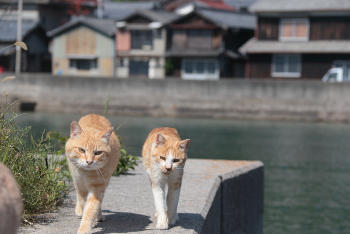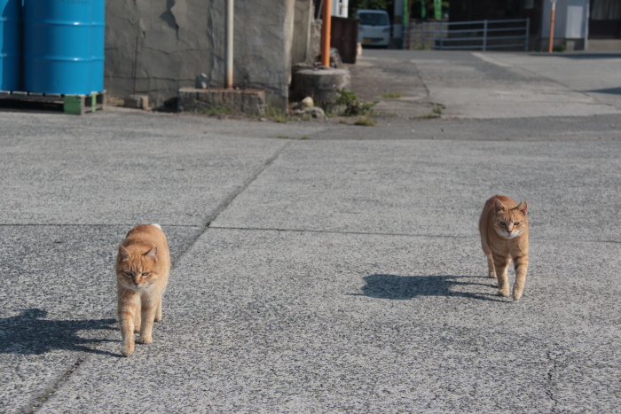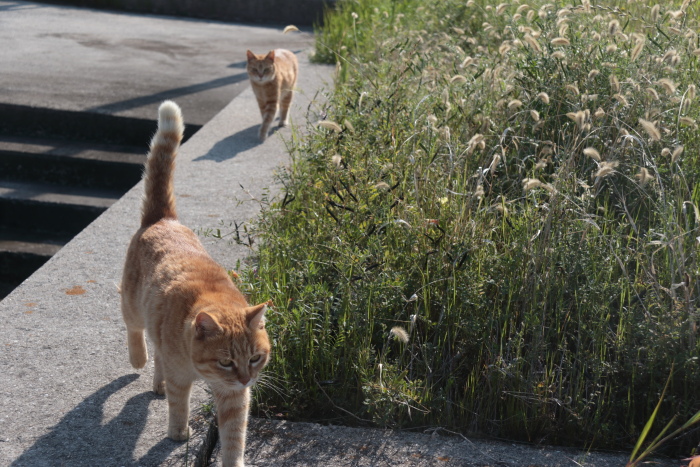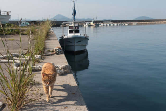 考えてみれば、ここ睦月の港で朝の撮影会を始めてもう10年以上になります。最初は偶然朝港にいる猫たちを見つけて写真を撮り始めたのでしたが、回数を重ねているうちに彼らも私の顔を覚えてくれたのか、私が港に向かうとこの二匹のように小学校から一緒についてきてくれる子も出るようになりました。撮影会終わった後にはモデル料としておやつあげたりしてるから、それを覚えちゃったかな?お母さんの話では他の人ではそういうことはないそうです。