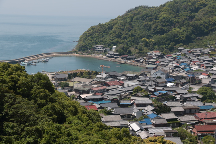 何度見てもいい箱庭のような風景。方角でいうと画面右側が北、奥が西、手前が東。北側・西側・東側ともに山に囲まれていて海からの強い風を防いでいる。天然の良港なのがここから見るとよくわかります。南からの強い風はあまり心配することはないんですよね。唯一ありうるのが台風ですが、台風がここを通過する場合は大抵の場合すぐ南にある四国山脈を超えてくるのでその時点で勢力がかなり殺がれますから。唯一危険なのは豊後水道を北上する場合ですが、あまりそのコースを通る台風は多くない。とはいえ、それは過去のデータでのことで、地球の気候が変わりつつある今日、これからもそうだとは断定できませんが…。