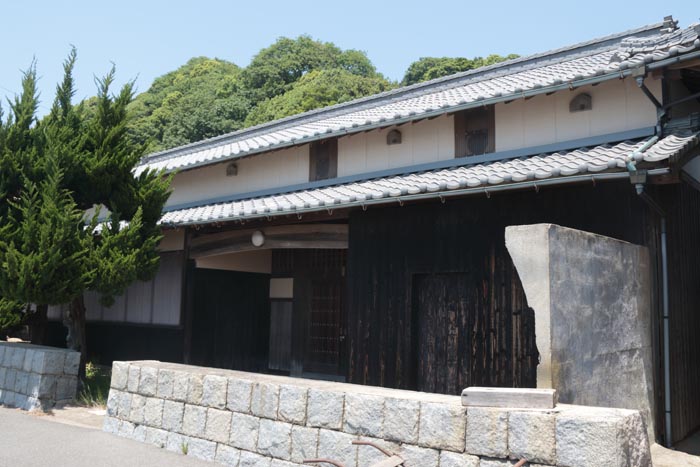 東の浜の各所に残る長屋門。関東の農家などでも長屋門はよく見られますが、この睦月の長屋門は関東のそれとは比較にならないくらい大きいものが多く、しかもそれが浜に軒を連ねている。かつて伊予絣の生産と行商で栄えた睦月。2,000人近くいた島民のうちの三分の一が伊予絣の行商に従事していたといいます。それによって築かれた島の富の象徴がこの長屋門でした。