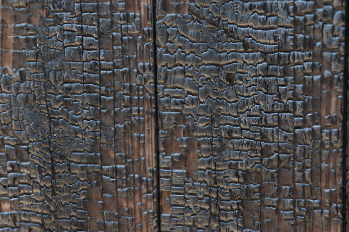 これは「焼杉板」といって、杉の表面を焼き焦がして炭素層を形成させた木材で壁を作る日本ではかなり古くからある手法です。腐敗や害虫に強いと言われていますが、なぜか東日本では見られない。