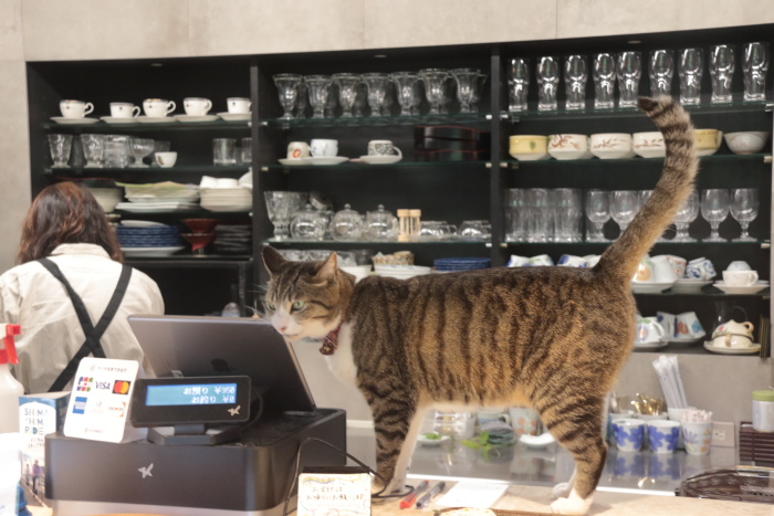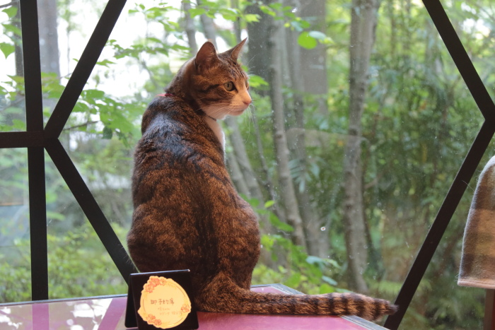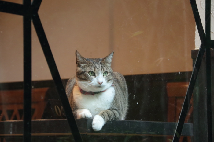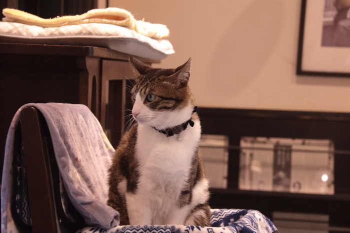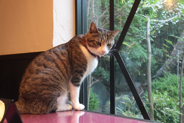 だから、このお店に来たら窓際席の一つ隣りの席に座れば間近に猫たちを見られることが多いです。もっとも気まぐれにあちこち歩き回ってますけど、閉店間際にはここに戻ってくることが多いそうで。