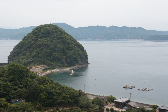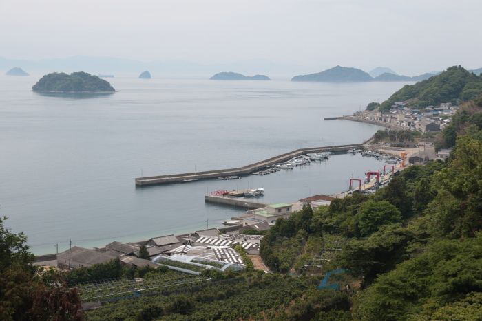 中腹から見る上怒和の港。背後の島々の多島美が味わえる風景ですが、残念ながら海の色が…。