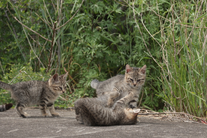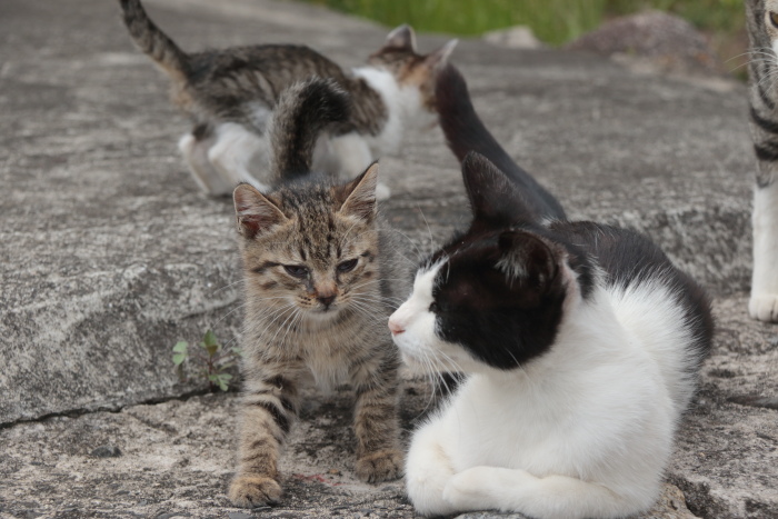 猫って親戚同士で互いの子供の世話をすることがあります。これは他の島でもよく見た事例。