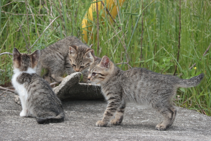 猫の春の発情期は個体差があるのですが、おおむね平均的には2月から4月の間が多い。猫の妊娠期間はおおよそ2か月ですから4月から6月の間に生まれる子がほとんどと言っていいでしょう。もっとも生まれてから1か月くらいは母親がつきっきりで人目に触れるような場所にはなかなか出しませんから、仔猫たちが姿を見せてくれるのは早い子でも5月初旬。多くの場合は5月下旬から6月と言うことになります。だからこの時期というのは仔猫はいてもなかなか姿を見せてくれないというケースも多いんですよね。