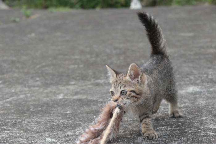 どの子もやんちゃで…しかも人を警戒するということをあまりしない。珍しいですよね。この頃の仔猫ってけっこう怖がりで人間が近づくとピュッと逃げちゃう子が多いんですが、この子たちはそれどころかジャラシに興味津々。
