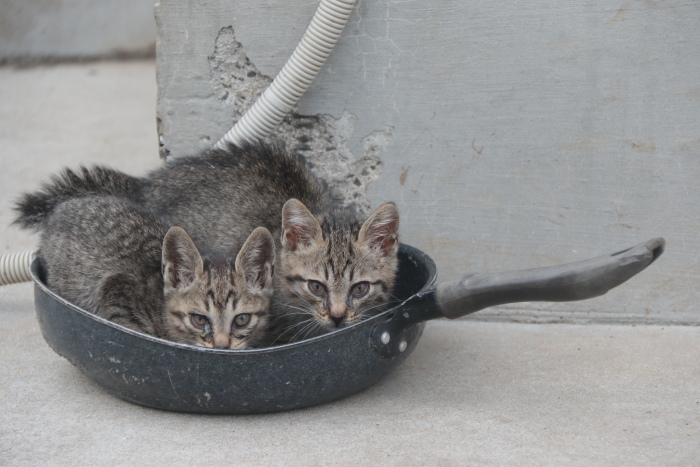 エサを入れるフライパンの中に入って「仔猫なべ」。