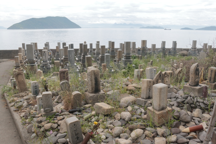 写真の手前側の背の低い墓石群が「埋め墓」、海側に並ぶのが「詣り墓」。