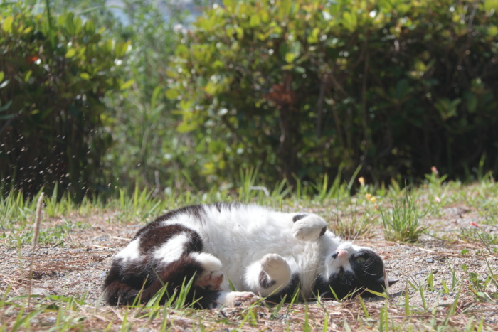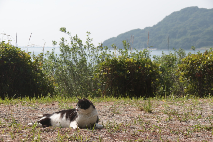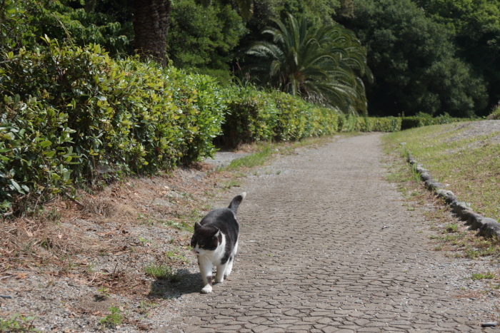 よく見ると遊歩道のそこここに猫用のお皿が置いてあって(景観を損ねないようにベンチの下などに置いてあるので注意して見ないとわかりませんが)、近隣の方が毎朝毎夕エサをあげています。「近隣」とは言っても、ここは市街地から丘二つ隔てた場所。周囲に民家はほとんどありません。廃業した旅館やユースホステルがあるだけ。