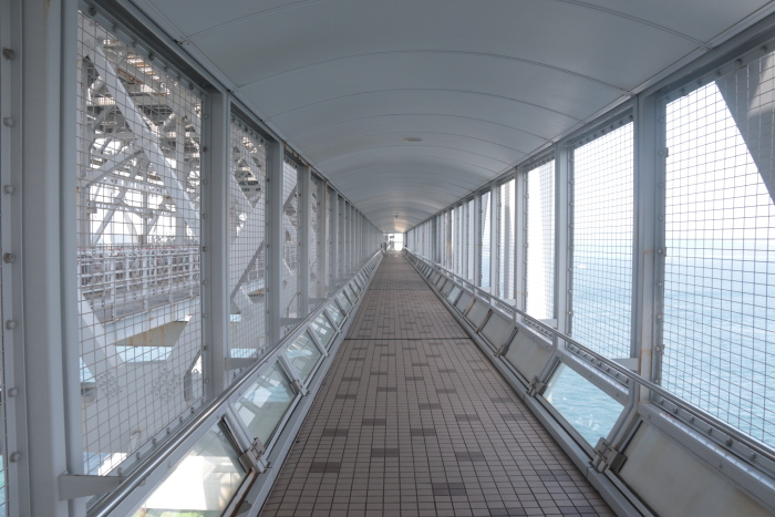 右側の窓はガラスが入っていません。網が張ってはありますが素通しです。だから海風が直接入ってきます。風の強い日はちょっと通れないですね。(一定の風速を超えるとこの観覧路は閉鎖になります)