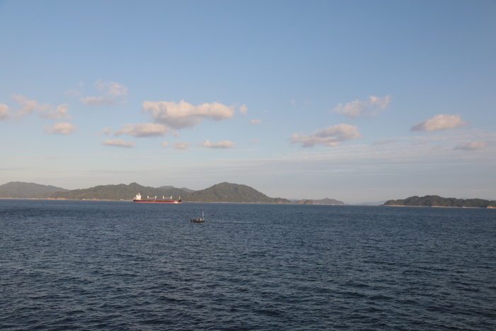 朝のうちはまだきれいに晴れていました。朝日を受けてこちらに向かってくる船。