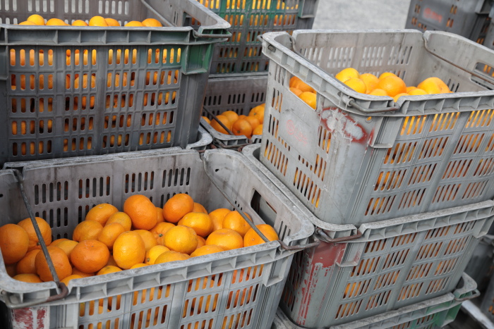 戻ってきたら、倉庫前にはまた新たなみかん籠が山積みに。これは午後の船に載せるんでしょうね。