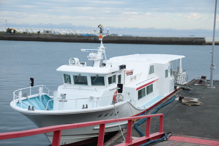 伊予長浜7:14着。桟橋に行ってみると、今日は乗船タラップがかかっています。