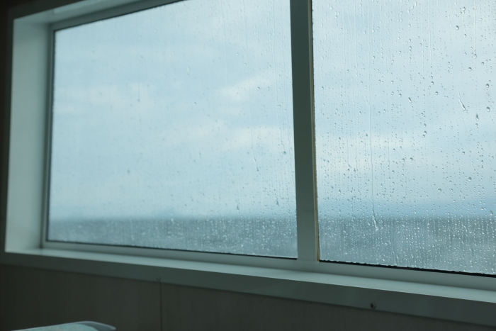 やっぱり海上は風がけっこうあるんですね。波は立ってないけど船がちょっと左右に揺れる。水しぶきが窓に。